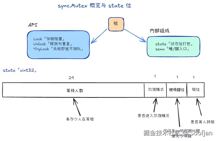 state:一个32位整数,里头同时塞了几种信息locked(锁位) :最低位,表示"这把锁现在有没有人占着"。Lock()快路径看它:state==0就能直接 CAS 抢走;拿不到就走慢路径。