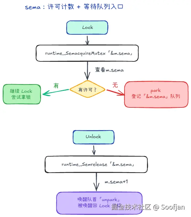Lock()不会再空转,而是调用运行时的sema获取:拿不到就睡,等Unlock()把你叫醒 。 - 你可以理解为:sema把"等锁"这件事变成了"阻塞等待"。 - 醒了再继续抢(回到循环开头) - 被