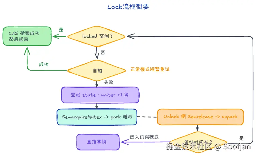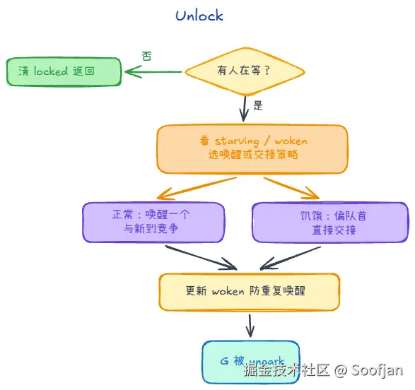 Unlock()叫醒后,你醒来并不会立刻"保证拿到锁",而是继续回到状态检查/尝试抢锁的逻辑里。 - 如果你等的时间足够久,runtime 可能把 mutex 切到starving模式:后续Unlock()会更偏向把锁直接交给队首等待者,避免一直被新来的插队拖长尾延迟。