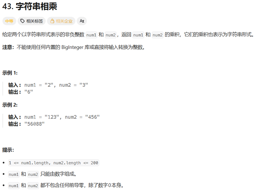 1.有了过往题目的经验,直接可以舍弃掉"先将字符转换为数字,相乘得出结果后转换成字符串"的错误想法,因为给定的两个字符串长度最长可到200,相乘一定会溢出。