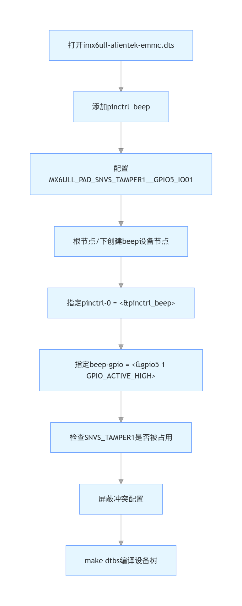 上一章我们通过pinctrl和GPIO子系统完成了 LED 灯驱动开发,而蜂鸣器驱动的核心逻辑和 LED 完全一致 ------ 都是控制 GPIO 输出高低电平。本章将以蜂鸣器为例,巩固 pinctrl+GPIO 子系统的使用方法,同时熟悉不同 GPIO 引脚(SNVS_TAMPER1)的设备树配置和驱动适配。