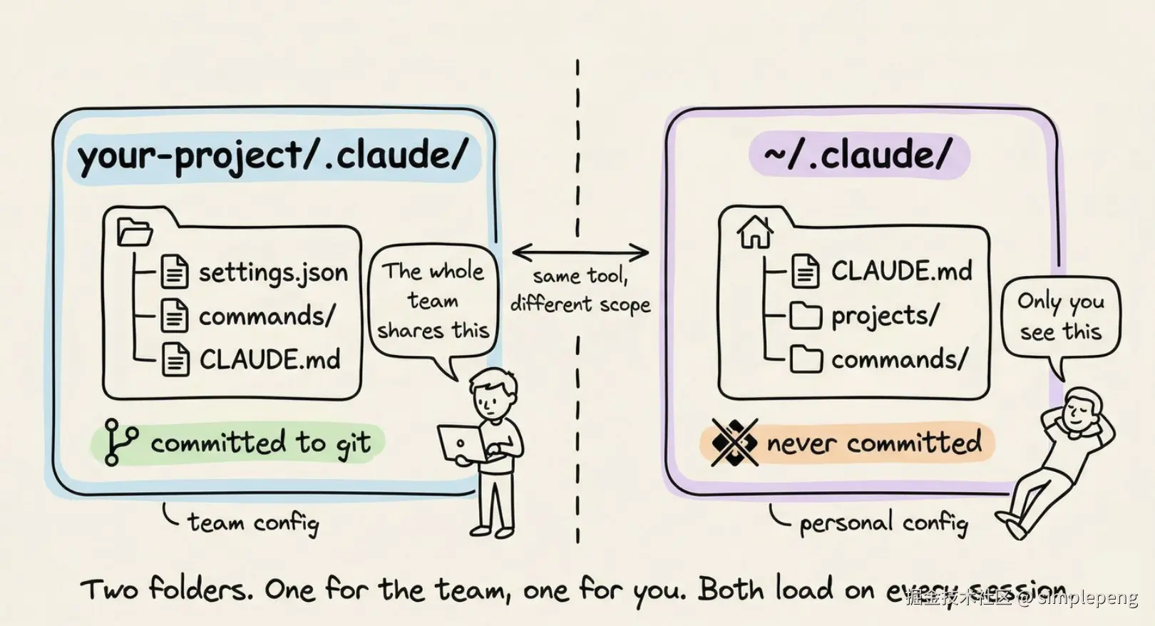 项目级别的文件夹包含团队配置。你将其提交到 git。团队中的每个人都会获得相同的规则、相同的自定义命令、相同的权限策略。