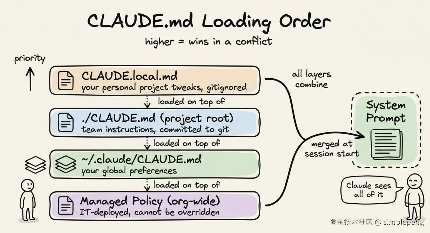 这是整个系统中最重要的文件。当你启动一个 Claude Code 会话时,它首先读取的是 CLAUDE.md。它会直接将其加载到系统提示中,并在整个对话中始终记住它。