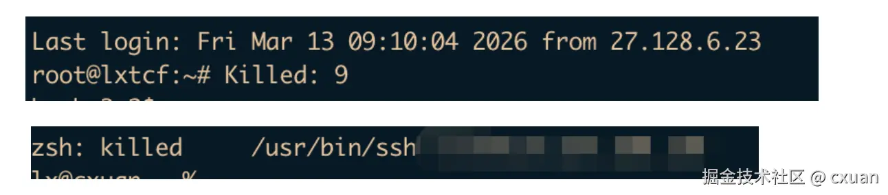 我把 SSH 二进制改名测试:cp /usr/bin/ssh /tmp/myssh && /tmp/myssh root@服务器IP,改了名字还是被杀,这说明也不是按进程名拦截的。