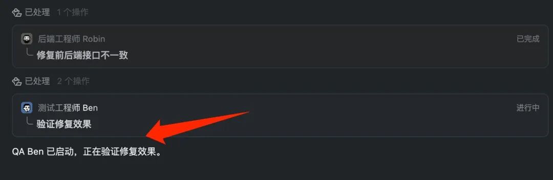 接着,代码评审员 Mark 发现前后端接口不一致的问题了,然后 Leader Agent 紧急召唤了后端工程师 Robin 加入专家团队,进行代码的修复工作。