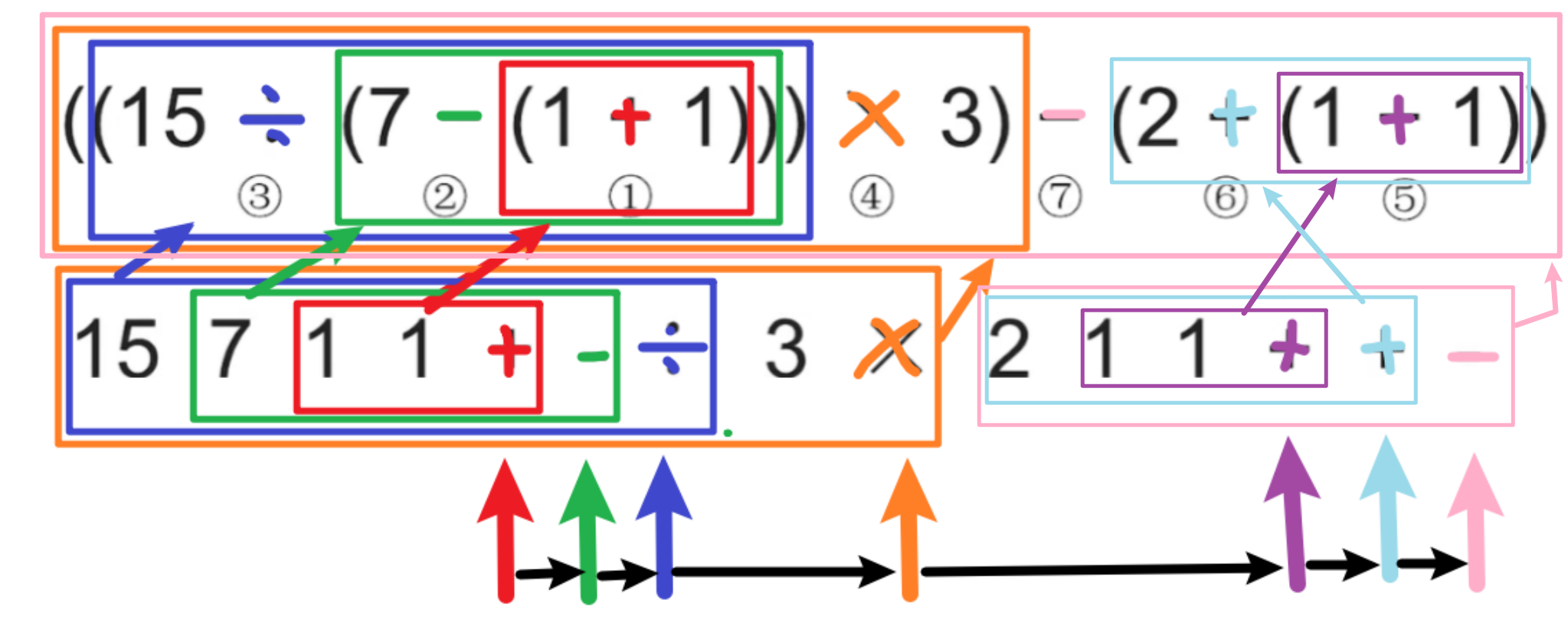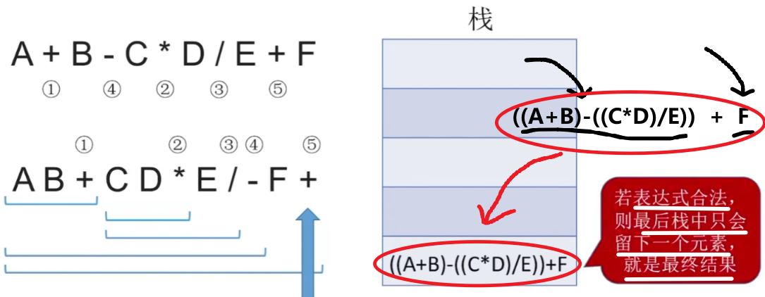 除了括号匹配,那么计算式子也用到了栈。比如下面式子,人类计算的时候可以找到中间的括号,根据计算优先级来算,但是计算机看不懂,这时候就要用其他的表达式来表达这个计算式,并利用栈。