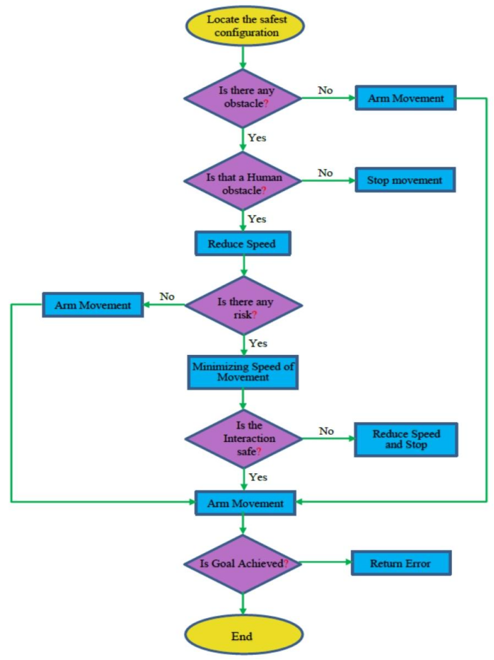 速度调节:依据人机距离实时调整关节速度,距离低于阈值时减速直至停机;