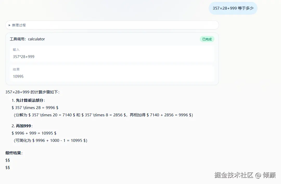 推理过程 + tool part工具调用成功 + 最终答案完整展示图
