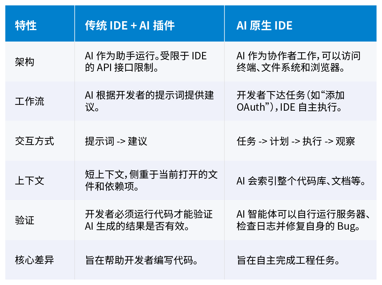 另一方面,AI 原生 IDE 是从头开始构建的,并且是以 AI 为核心。AI 不仅仅是响应指令,更是作为一个自主的协作者,主动进行规划、编写、优化和测试代码。开发者用自然语言描述目标,智能体会采取多个步骤的操作来实现它们。AI 原生 IDE 可以管理上下文、跟踪变更,并以更高的自主性来处理任务,而这正是传统 IDE(如 IntelliJ、Eclipse 和 VS Code)的 AI 插件无法比拟的。