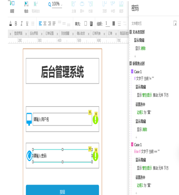 从左侧元件库拖出一个矩形,w为400,h为500,命名矩形一。然后在拖出一个矩形,设置w为370,h为70,命名为矩形2,双击矩形框,输入"文字后台管理系统"。然后复制矩形2两个,分别命名为边框1,边框2,然后在边框1,2中放入两个文本框,w为300,h为35,并为第一个文本框命名为"用户名",第二个命名为"密码",然后拖入四个图标分别放入边框1,2当中(感叹号命名为清除)。然后在边框2下方拖入一个主要按钮,最后拖动一个动态面板(这个地方是重点),动态面板分为第三个状态,分别是用户名或密码不正确、请输入登录账号、请输入登录密码,每个状态下放一个矩形,矩形内分别对应状态输入用户名或密码不正确、请输入登录账号、请输入登录密码,最后命名为""警告提示""。