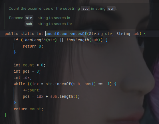 这个代码在平台写的jar里面。点开发现了不对劲的地方,count的值9.9个亿,心想应该是死循环了。他这个方法看注释是【统计s字符串在text字符串中出现的次数】