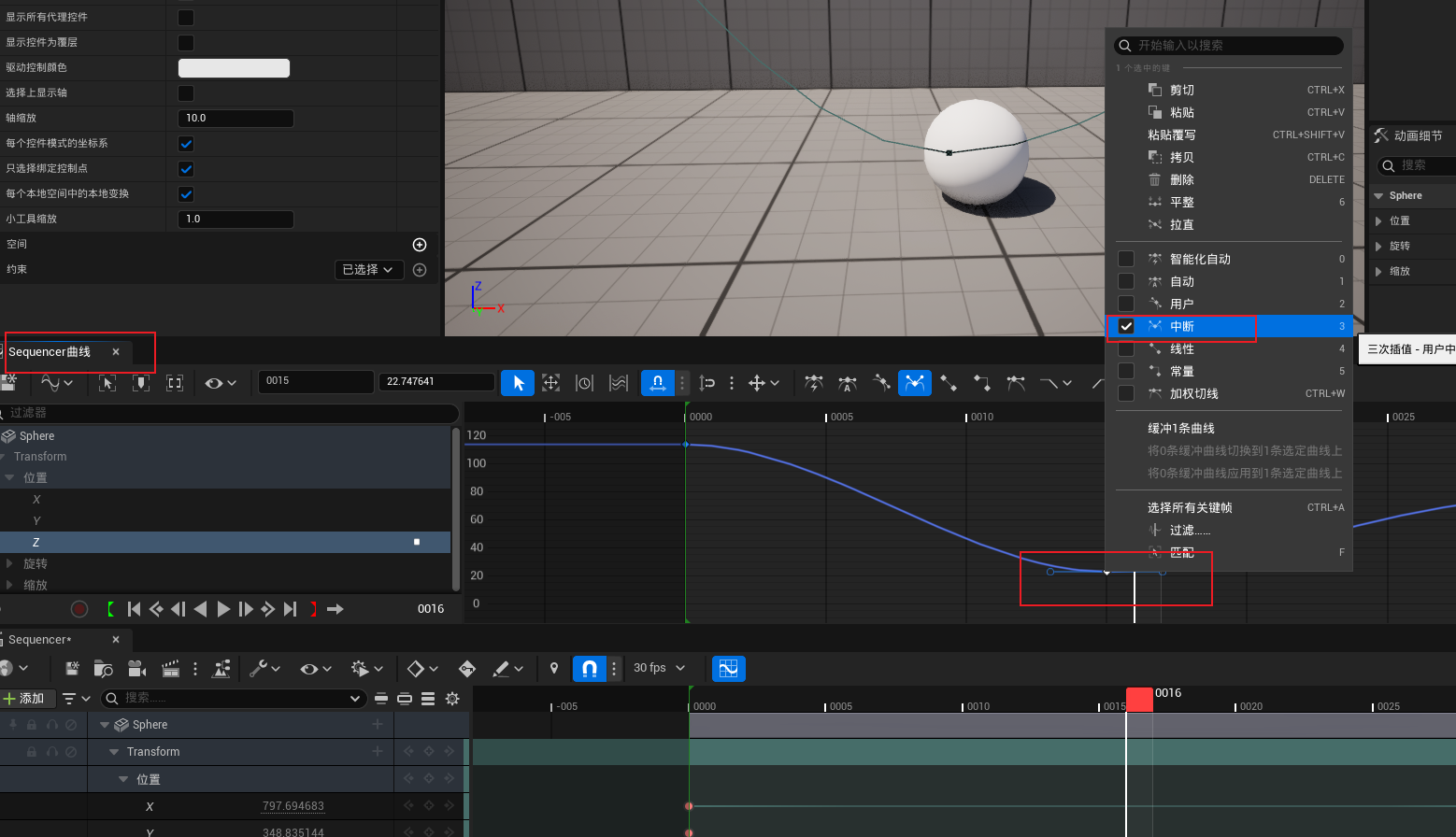 我们先在场景中添加一个球体。然后选中这个球体Actor,点击序列编辑器中的添加,来将这个球体添加到序列编辑器中,为这个球体制作动画。