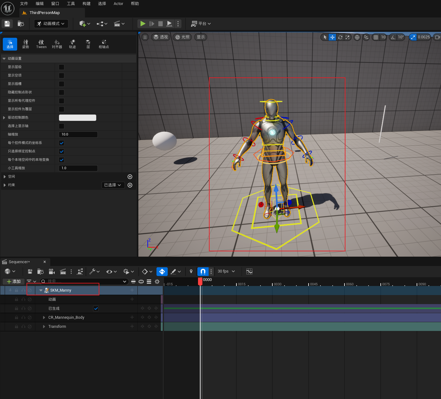 如果你想要给一个骨骼网格体制作动画,此时可以在内容浏览器中选中骨骼网格体,然后拖拽到序列编辑器的左侧空白处。然后序列编辑器中就有了一个骨骼网格体,并且关卡模式变为了动画模式。