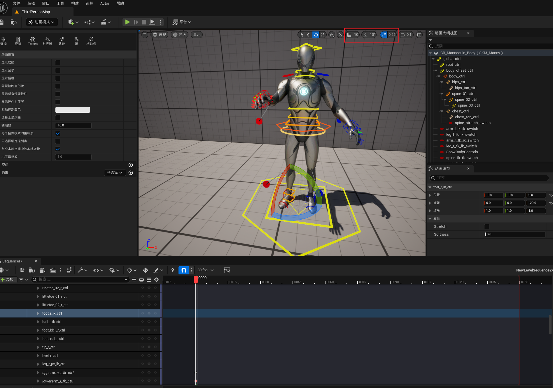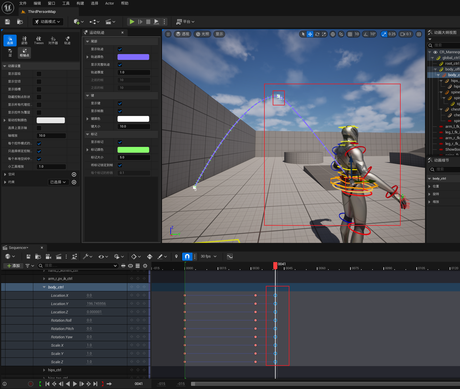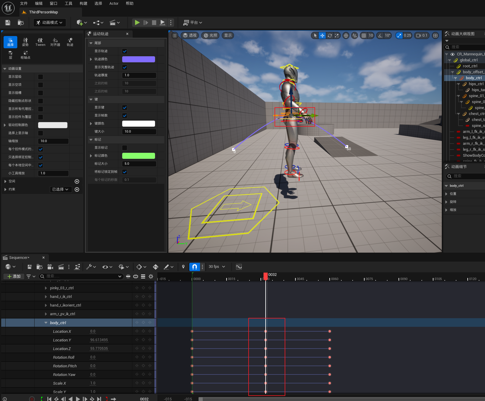 3.每一次先制作一个控制器的动画。例如先制作身体控制器的动画,然后再制作两个脚步控制器的动画。这样就只用在某个控制器的单一轨道上制作动画,比较清晰明了。还能明确角色在场景中的移动路径。
