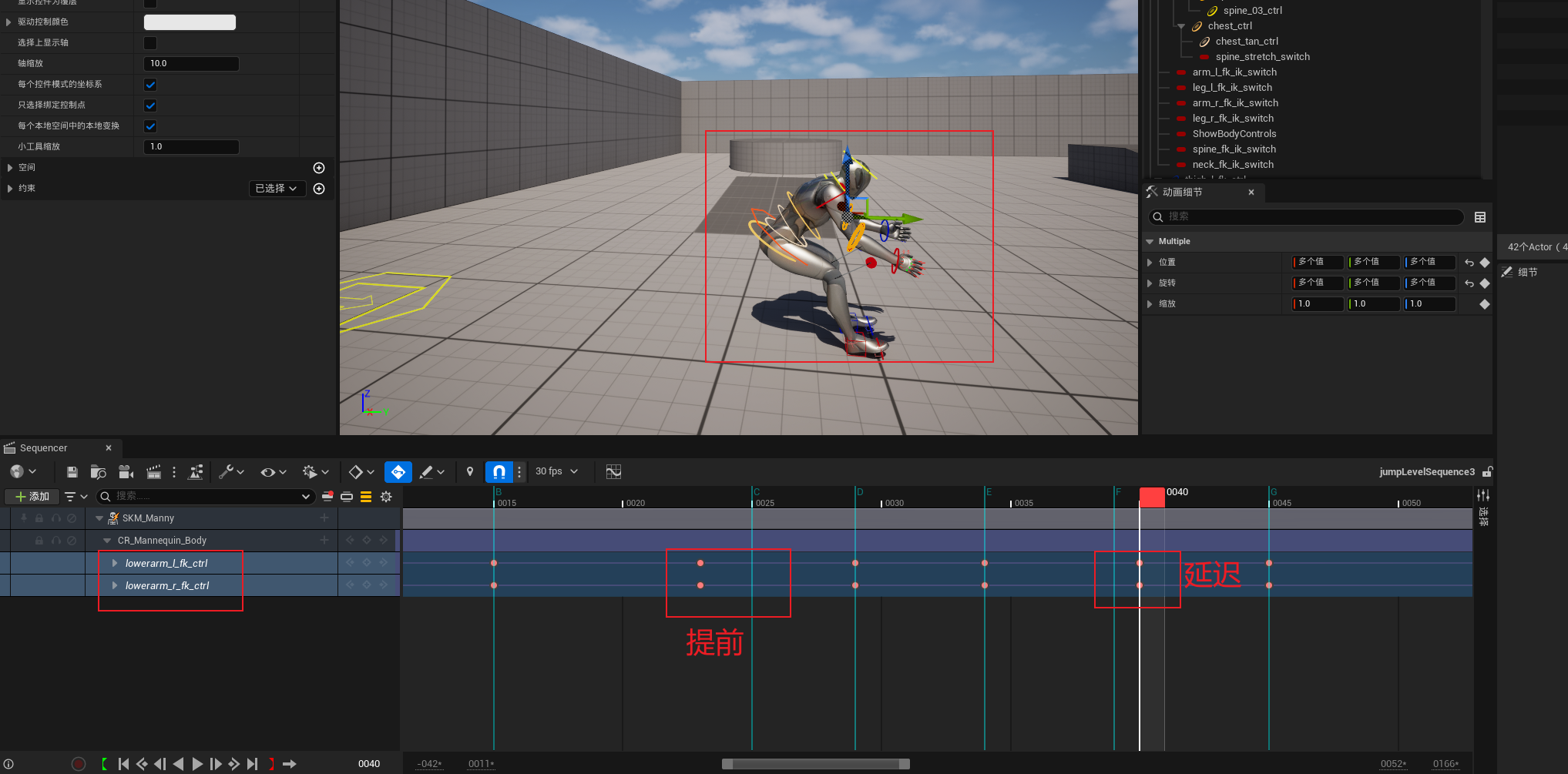 除了双臂控制器之外,我们还可以选中两个手肘控制器,然后调整两个手肘控制器提前或者延迟两三帧,以此来达到更好的动画效果。通过这样的微调,我们可以让动画变得越来越自然。