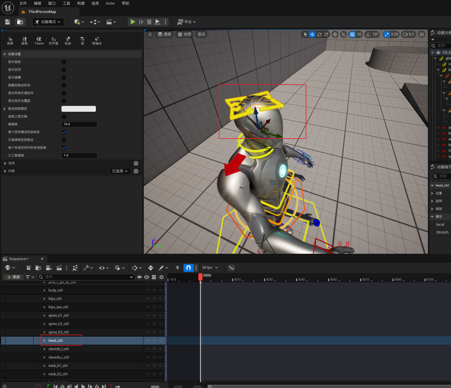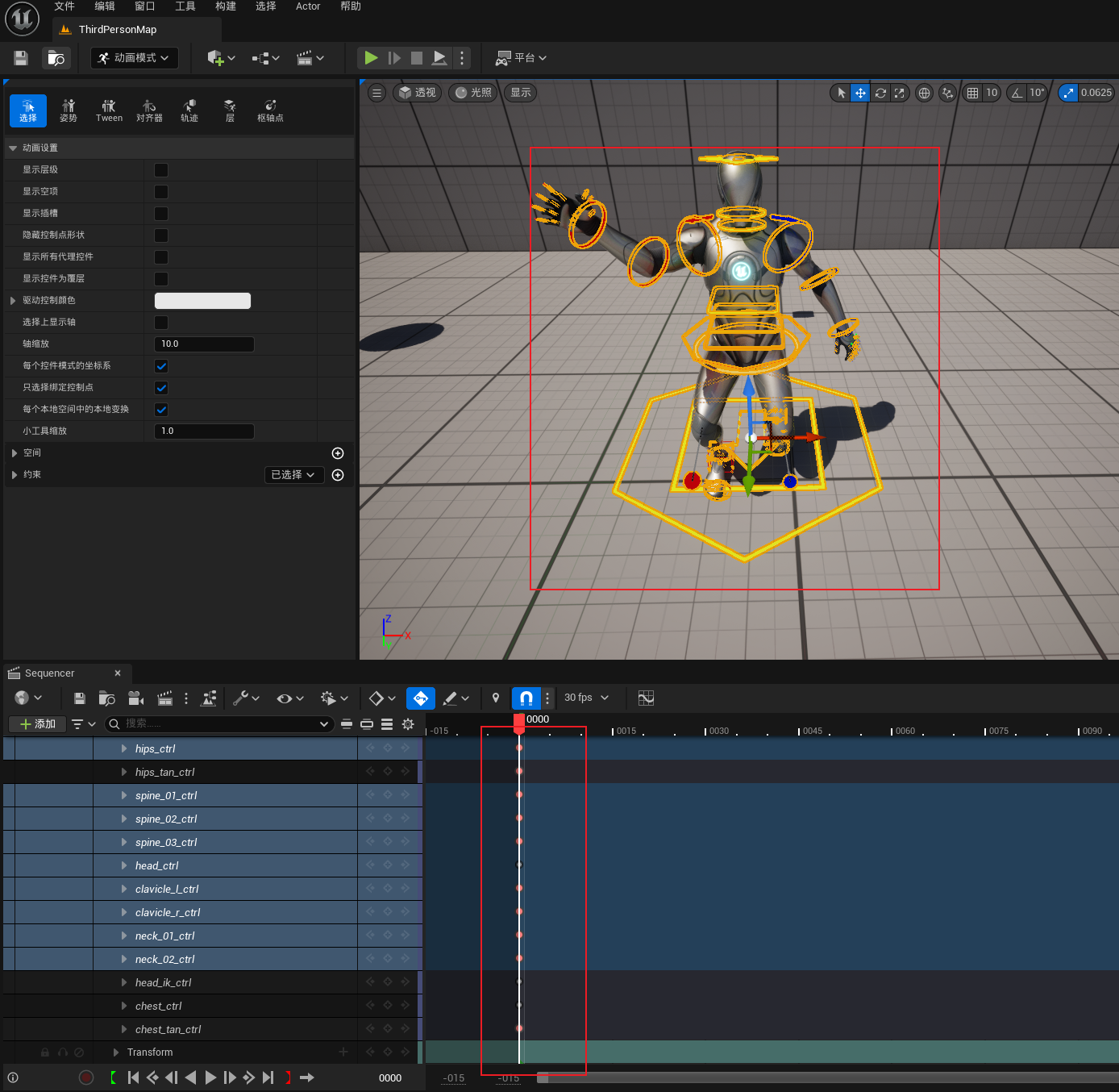 下面我们新创建一个关卡序列,然后将骨骼网格体添加到序列中。然后给骨骼网格体摆一个下蹲姿势。然后给CR人偶模型的所有控制器都打上关键帧。