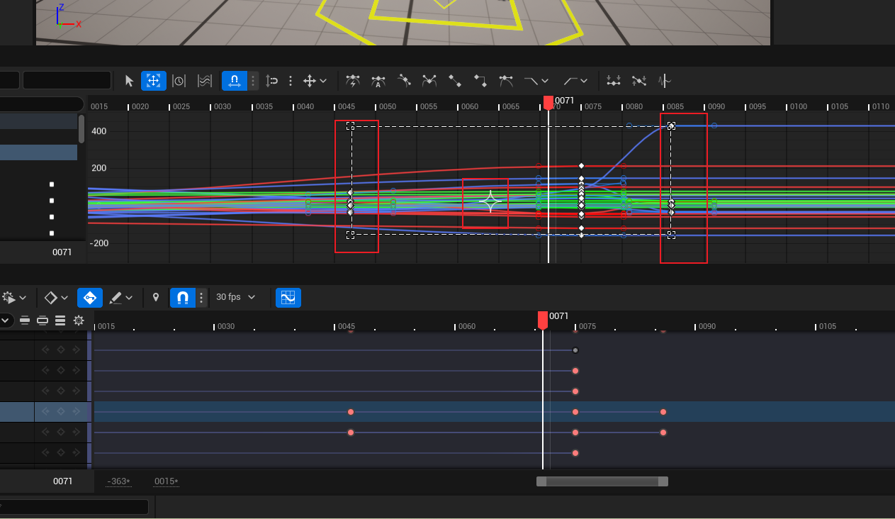 还有一个小技巧就是当我们选中多个关键帧后,按F按键可以将时间线聚焦显示我们选中的所有关键帧。