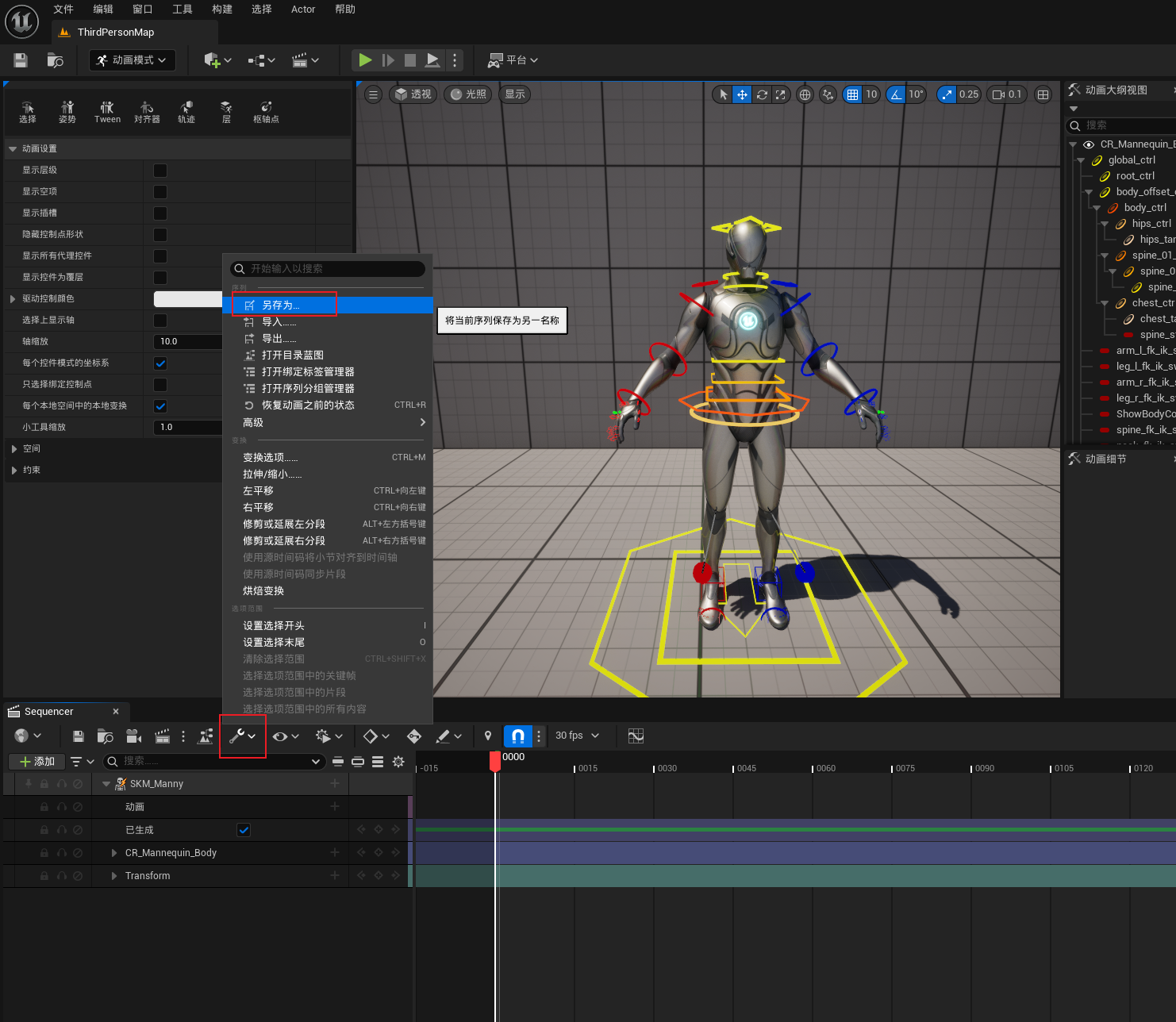 如果我们想要在项目中使用这个动画或者将这个动画导出,我们需要将这个动画烘焙为一个动画序列。我们在序列编辑器中先选中骨骼网格体的根节点,然后右键选择烘焙动画序列。
