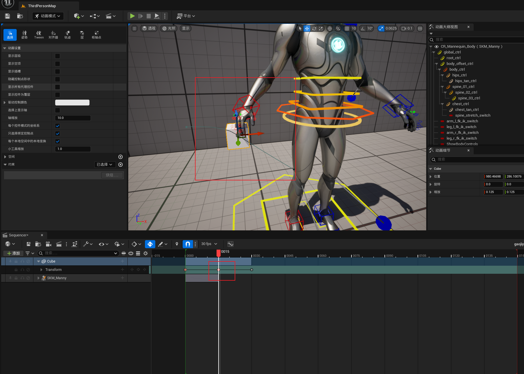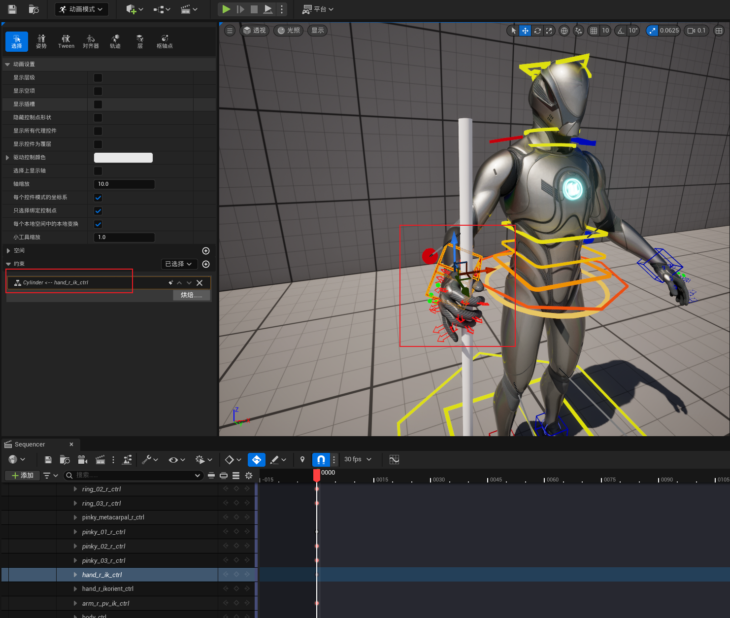 下面我们重新创建一个关卡序列,然后将骨骼网格体添加到序列中,然后将手部控制器使用IK模式。然后我们再创建一个立方体,并且将立方体也添加到序列中。