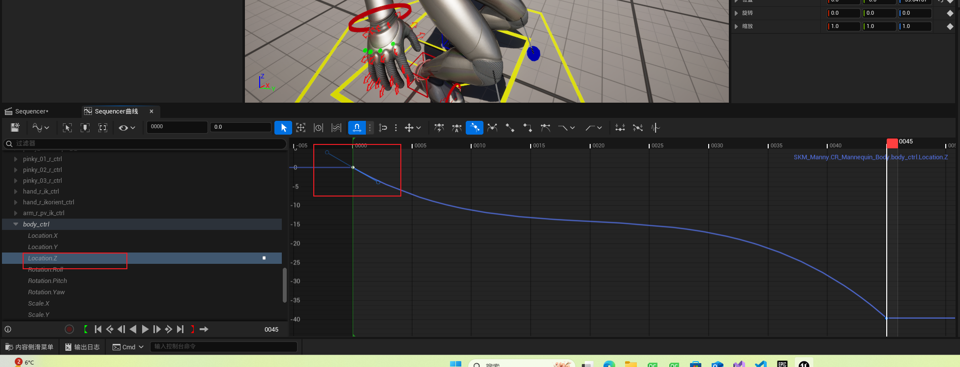 这一点我们也可以通过序列曲线编辑器窗口观察到。在序列曲线编辑器窗口中,可以看到身体控制器的Z值在起始关键帧和中间关键帧之间变化的很快,然后在中间关键帧和结束关键帧之间变化的很慢。