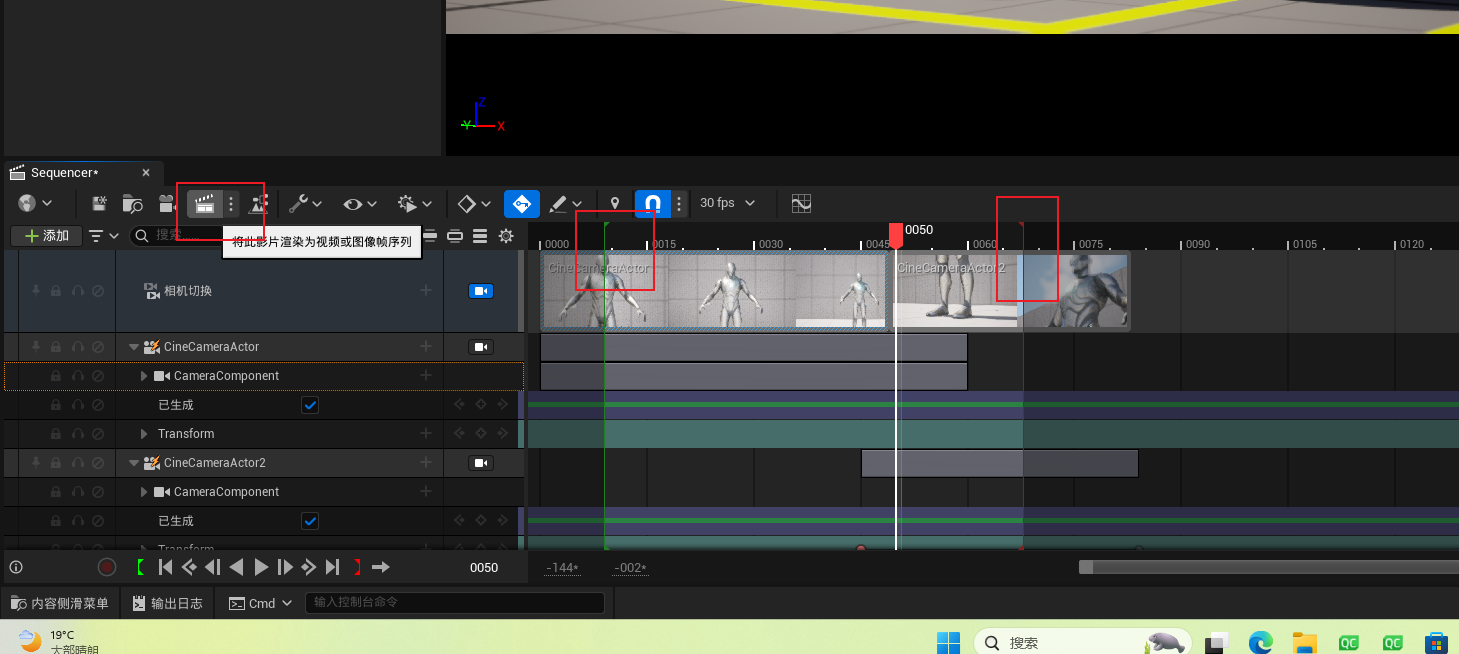 如果我们想要将相机切换的画面进行视频导出。此时我们可以拖动起始和结束括号选中想要的视频片段。然后点击导出图标,在渲染影片设置中设置导出视频的帧率、位置等,然后点击捕获影片。