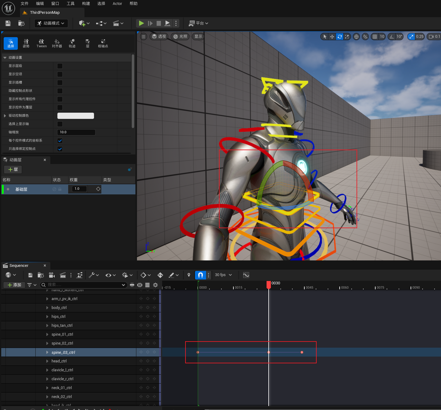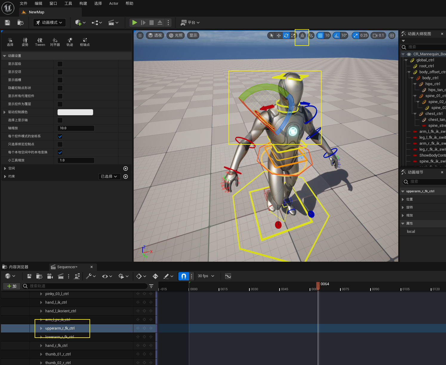 当我们选中骨骼网格体的右肩控制器时,此时这个控制器是一个FK控制器,当我们在局部坐标系下旋转这个右肩控制器时,可以看到此时模型的整个右臂模型都会跟着旋转。
