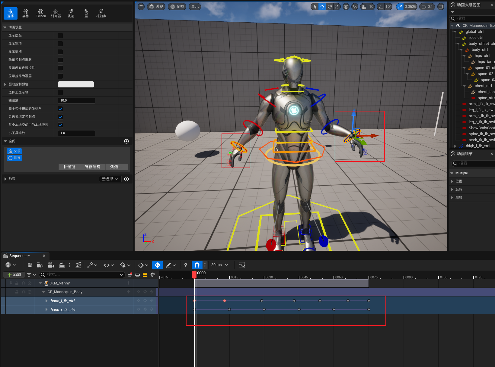 当我们选中一个手部控制器时,点击空间,可以看到它此时在父项空间中,即父项坐标系中。所以当我们选中全局控制器,然后移动全局控制器时,手部控制器会跟着全局控制器一起移动。