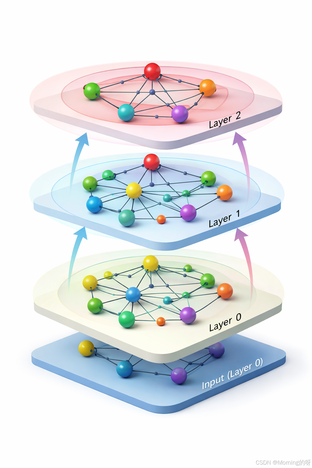 可以理解为每一层都是同一个节点,只不过是每层都在不断更新邻居,更新节点的表示,并逐层融合更远的信息。