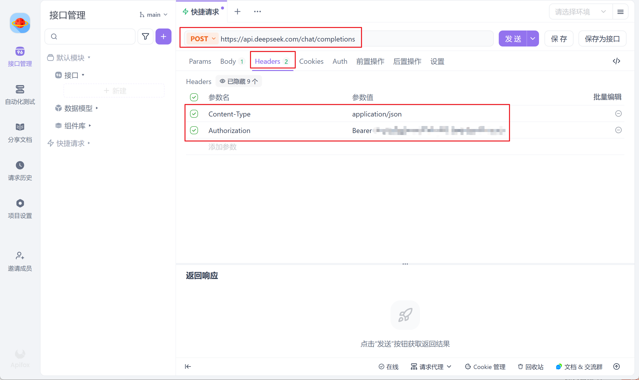 Authorization: Bearer ${DEEPSEEK_API_KEY},其中的${DEEPSEEK_API_KEY},需要替换成你刚刚创建的API Key。