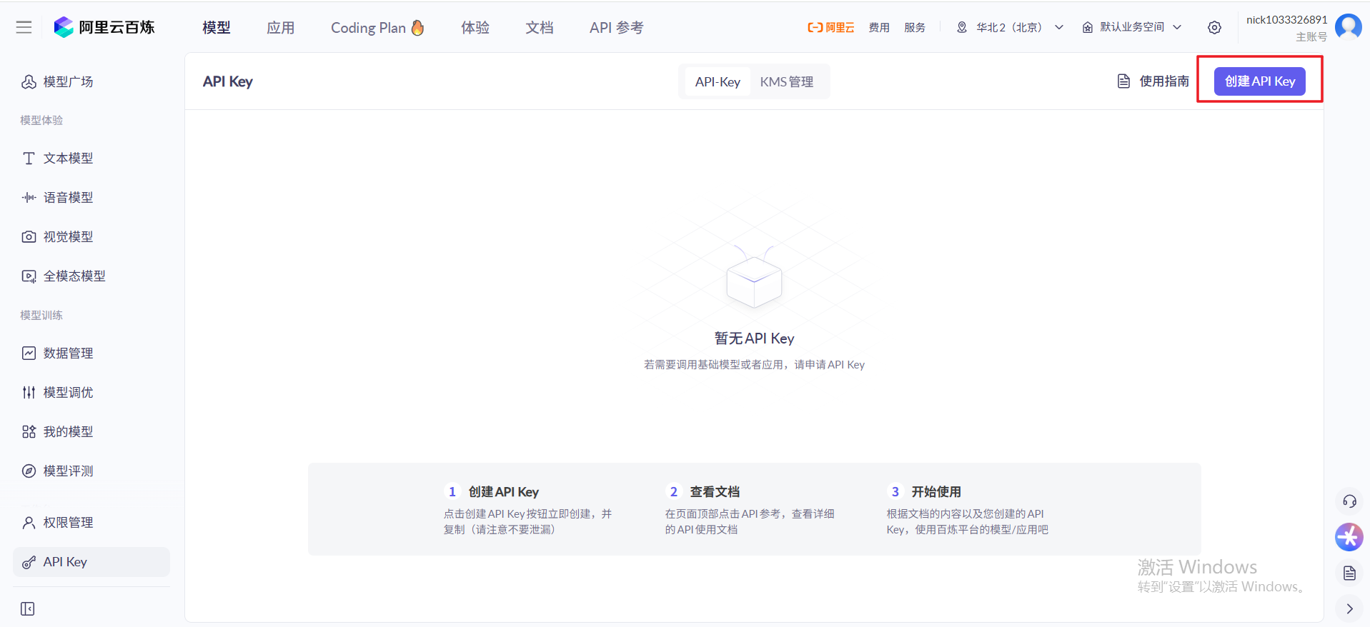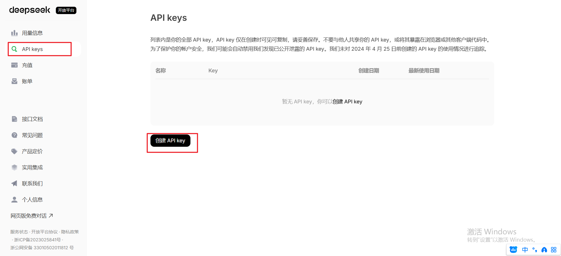 1.创建API key:创建的时候,记得复制并保存API key的值,因为创建完成后,这个值就看不到了。