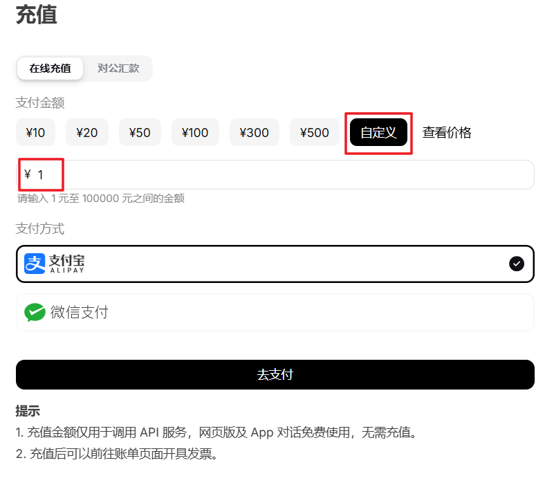 2.调用API需要钱,所以我们需要充值,此处我们充个1块钱就行,可以使用很长时间