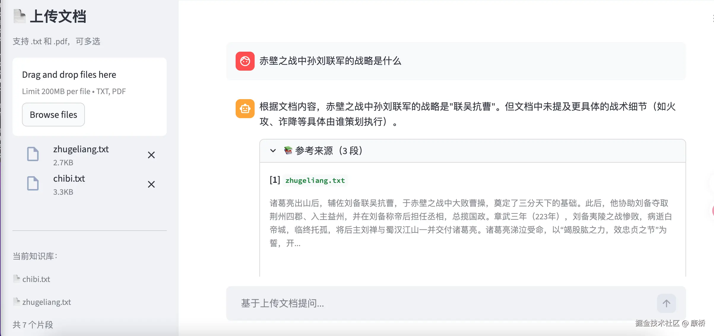 上传了三篇文档------曹操介绍、诸葛亮介绍、赤壁之战介绍。问曹操能答,问诸葛亮却回答"文档中未提及"。