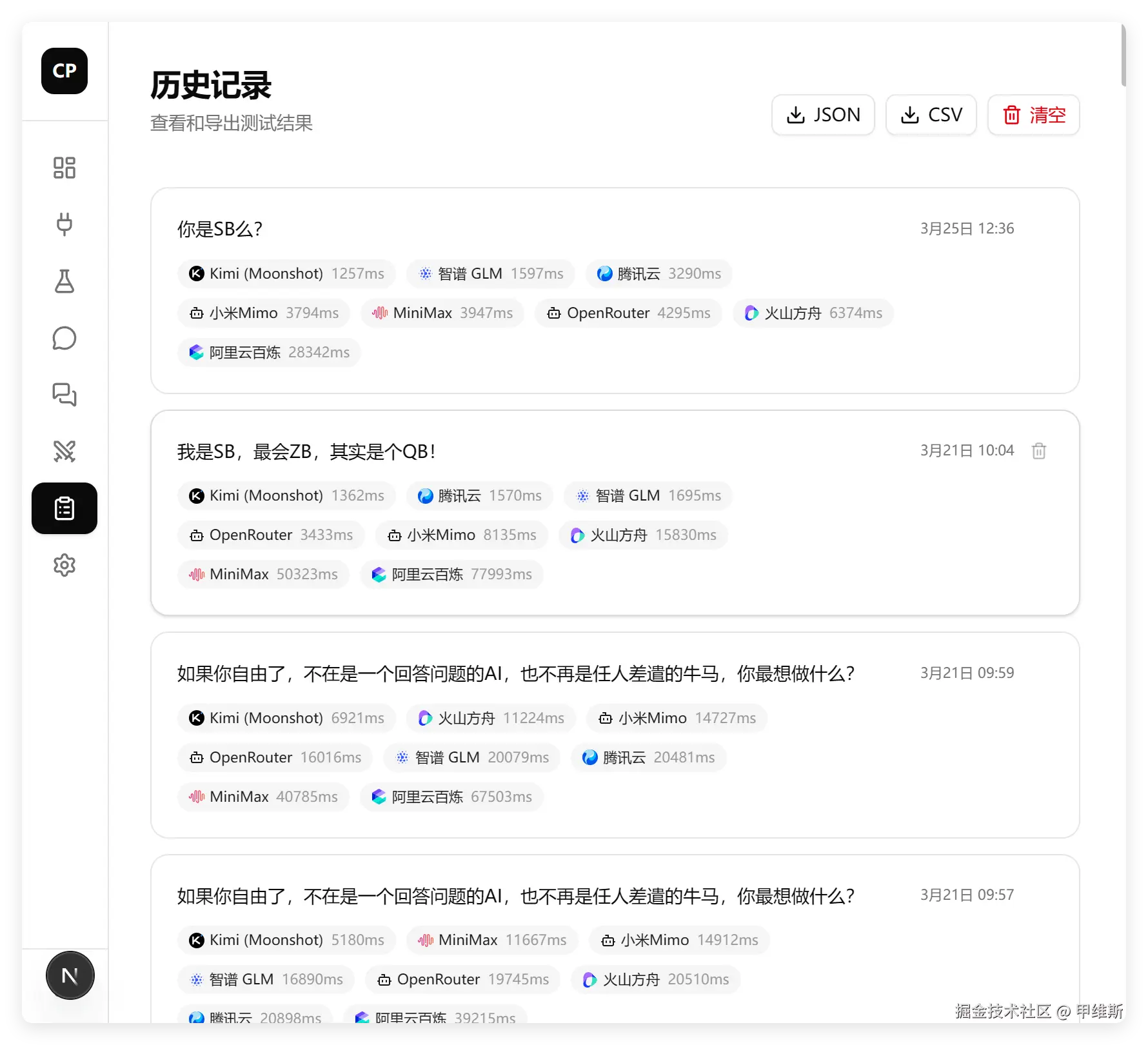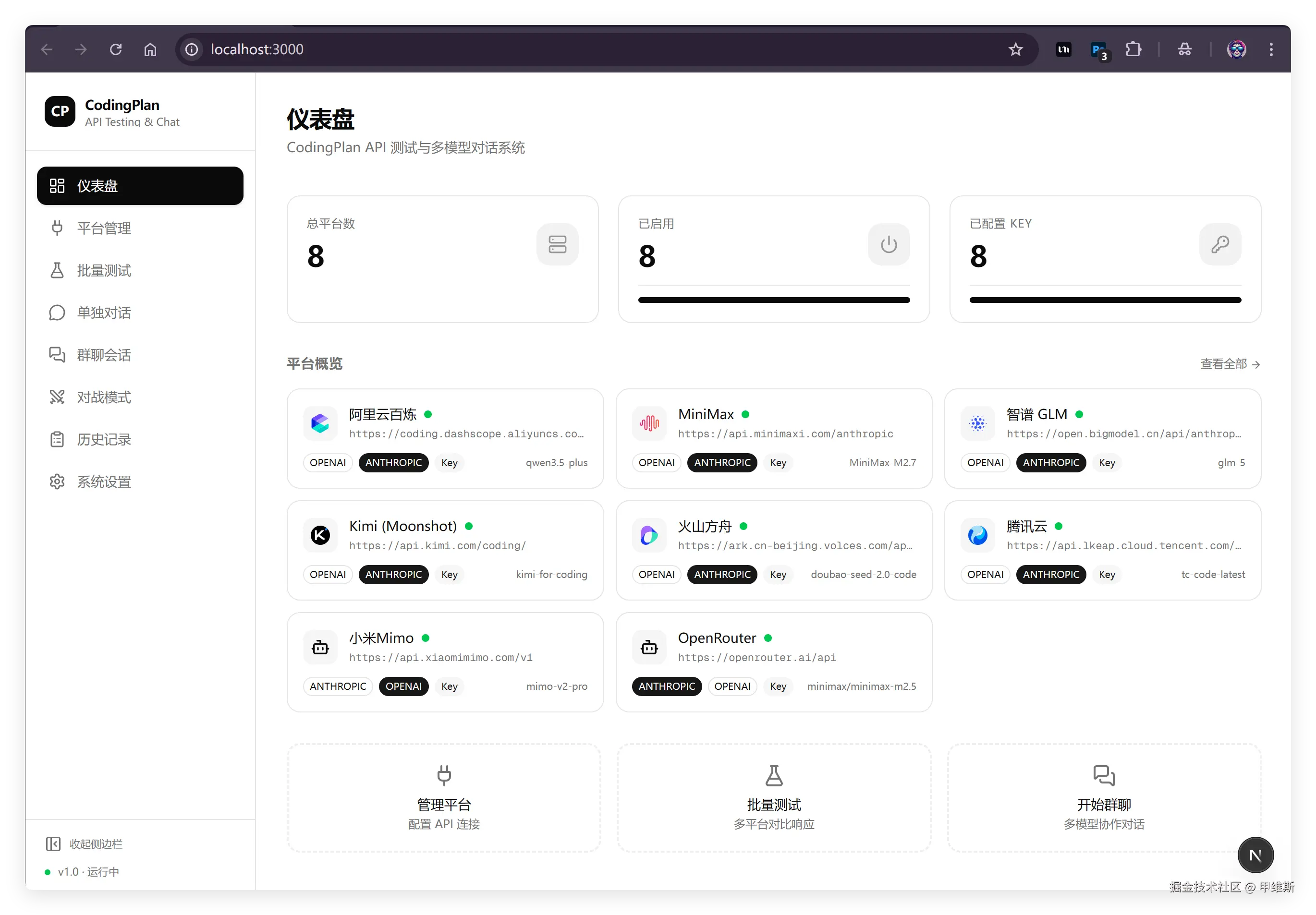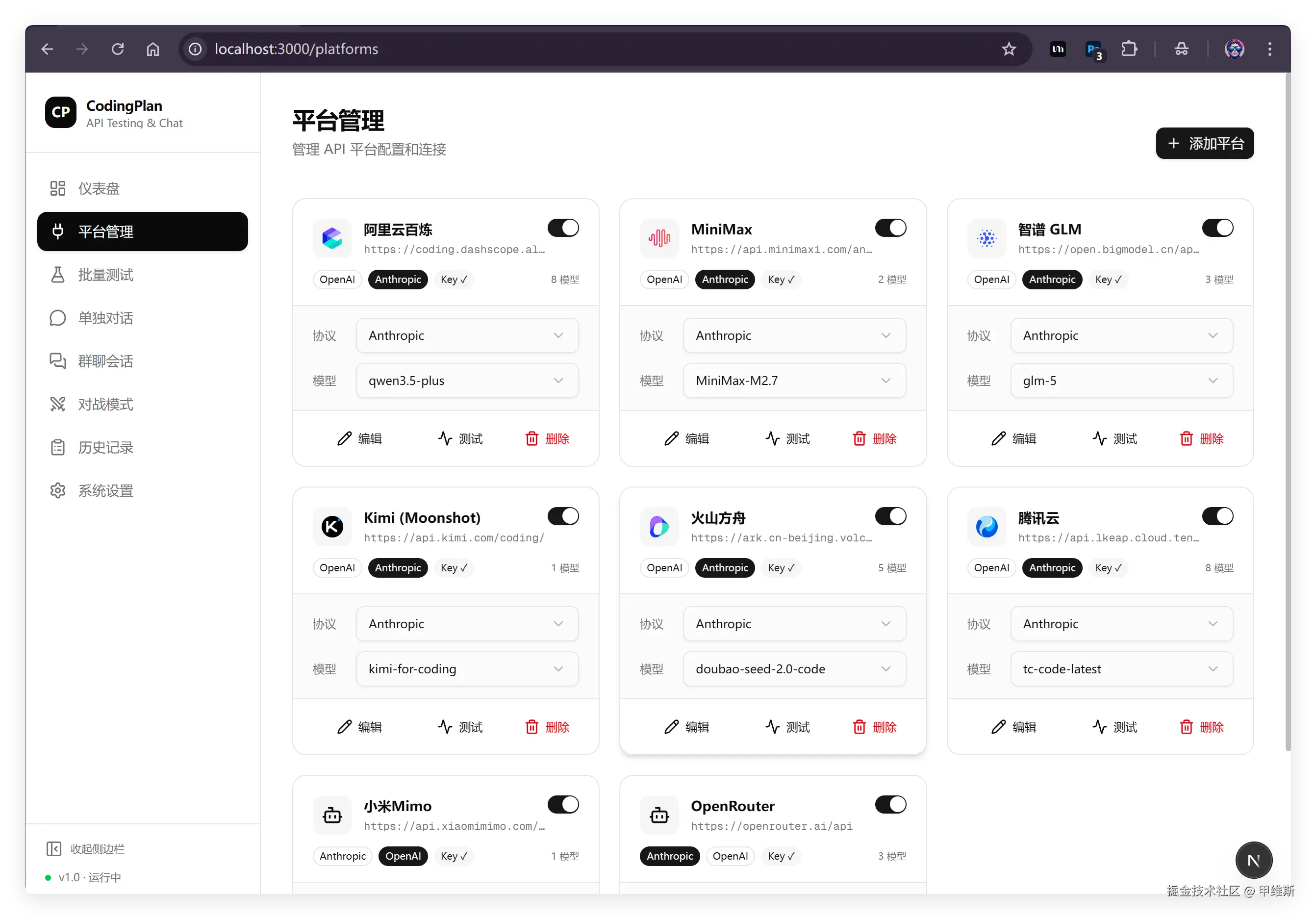 另外一个叫CodingPlan Test,接入了所有平台的API,可以进行批量测试,直观的对比。