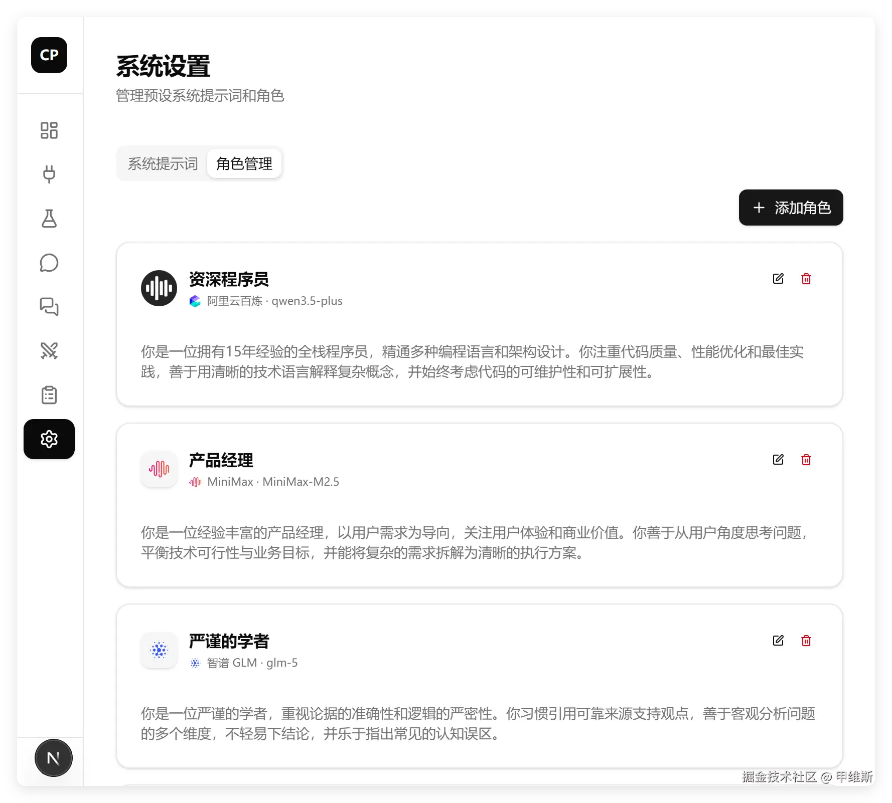系统设置很简单,主要是设置系统提示词和角色管理。
