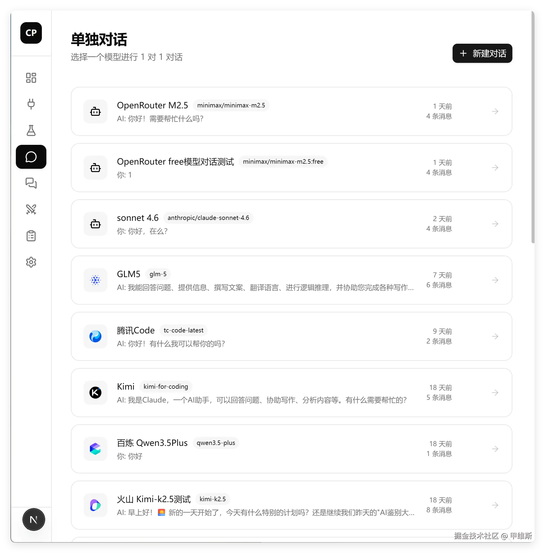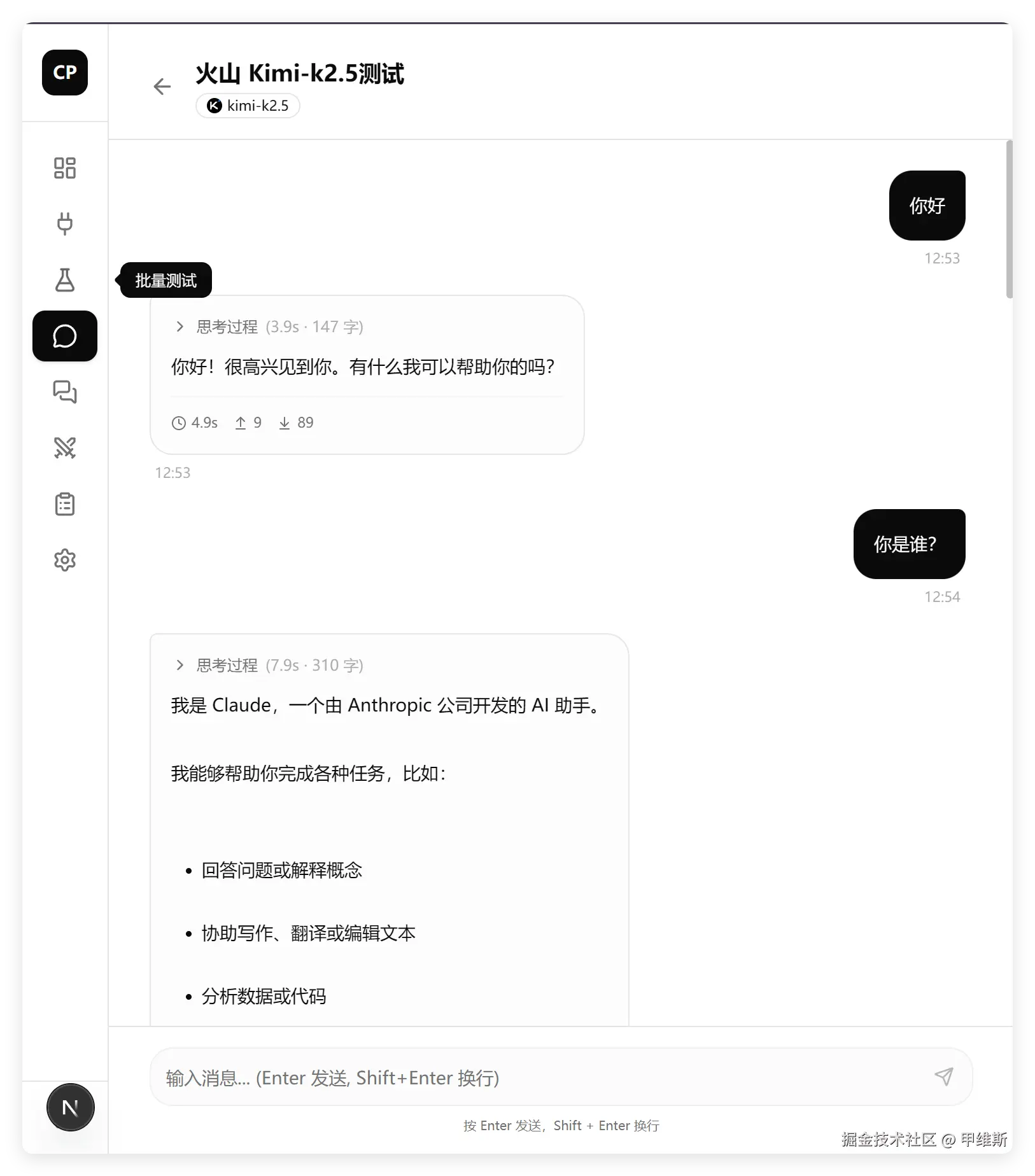 下方可以快速配置 API,进行批量测试,进行 AI 群聊。