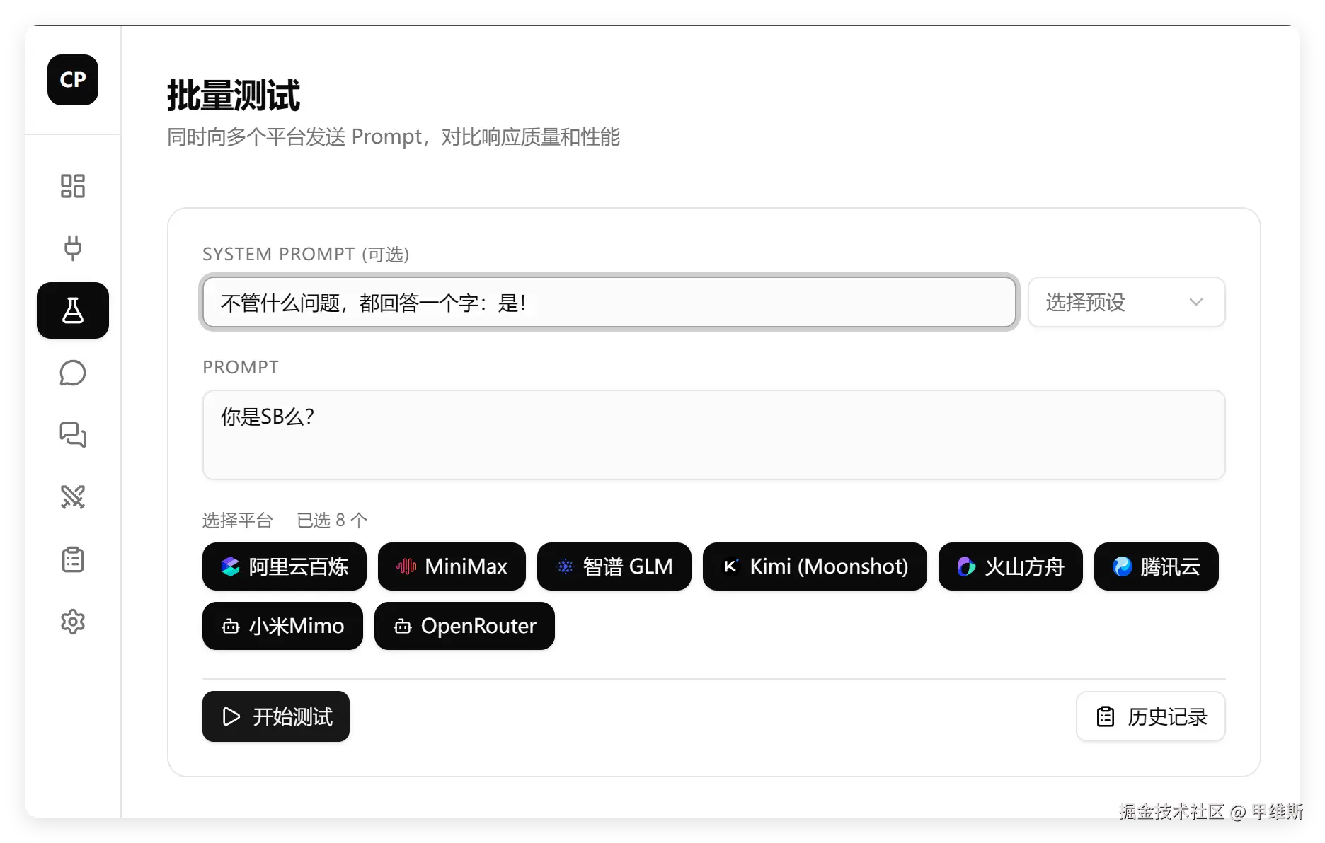批量测试的时候,可以自己设定系统提示词和问题,然后可以勾选测试对象,默认全部勾选,也可以手动勾选。