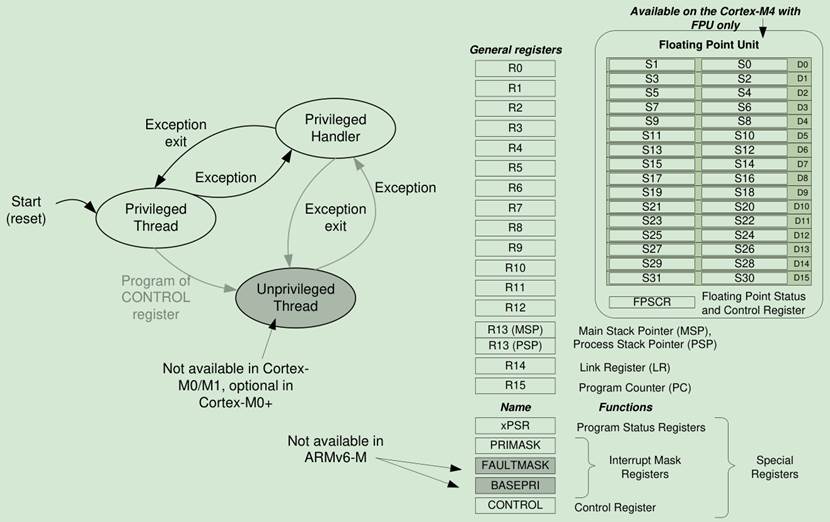 Cortex-M 处理器系列的programmer model很类似。例如,R0 到 R15、PSR、CONTROL 和 PRIMASK 对所有 Cortex-M 处理器都是可用的。两个特殊的寄存器(FAULTMASK 和 BASEPRI)只在 Cortex-M3、Cortex-M4 和 Cortex-M7 上可用,而浮点寄存器组和 FPSCR(Floating Point Status and Control Register)则仅在 Cortex-M4/M7 内部的可选浮点单元中可用,如下图所示。