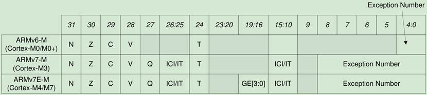 Programmer model的另一个区别在于 PSR(Program Status Register)。在所有 Cortex-M 处理器中,PSR 可以细分为Application PSR、Execution PSR 和Interrupt PSR。在 ARMv6-M 中,APSR 中的 Q 位和 EPSR 中的 ICI/IT 位并不存在,而 GE 位仅在 ARMv7E-M 中可用(例如 Cortex-M4)。此外,ARMv6-M 中 IPSR 中中断编号的宽度范围较小,如下图所示。
