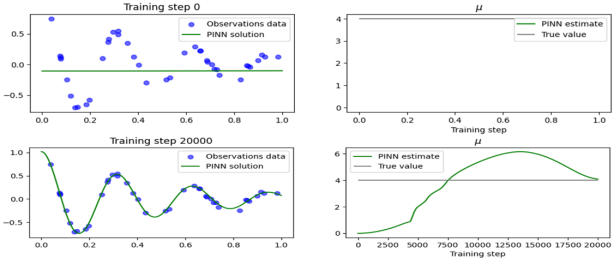 物理信息学习神经网络是一种强大的工具,它结合了深度学习技术和物理定律,使其不仅可以解决给定输入预测输出的问题,而且可以处理利用给定输出确定模型参数。本案例利用存在噪声的观测数据识别阻尼振动方程中的摩擦系数μ。