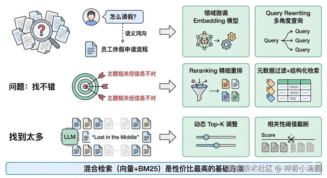 数据处理好了只是第一步。用户提了一个问题,系统能不能从成千上万的 chunk 里把最相关的那几条找出来,这是 RAG 效果的命脉。检索质量的问题可以用三个词概括:找不到、找不准、找太多。