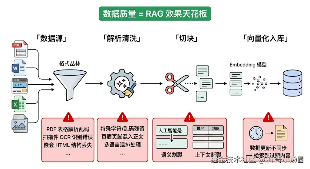 RAG 的效果上限不是由模型决定的,而是由你灌进去的数据质量决定的。这一点在 demo 阶段很容易被忽略------用几份干净的 PDF 文档做测试当然效果好,但真实业务场景中的数据源远没那么理想。