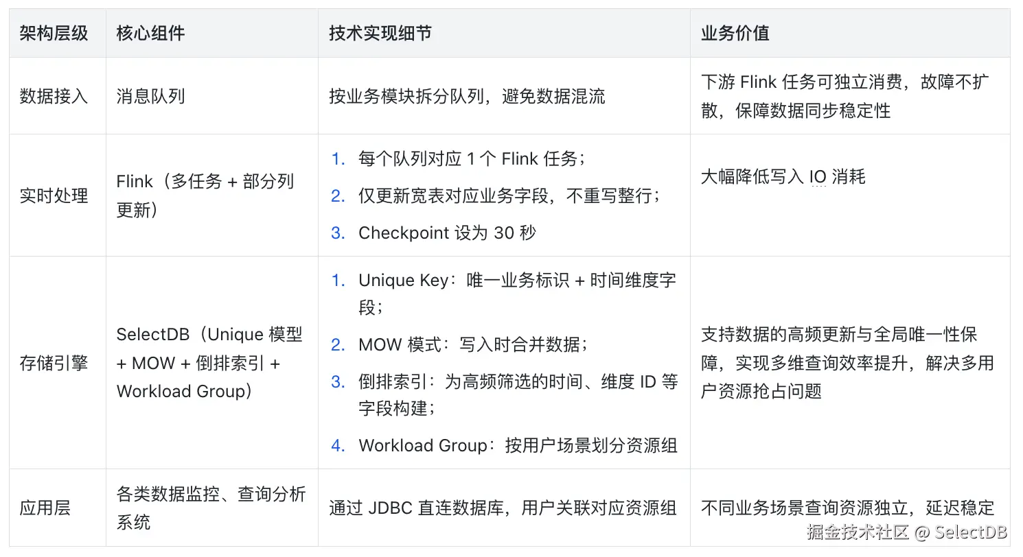 基于 SelectDB 构建的全新实时分析架构,突破了原有架构的设计瓶颈,实现了全链路性能、效率与稳定性的提升。本次架构优化的核心,是依托 SelectDB 在高频实时更新 与倒排索引加速多维查询两大方向的独有技术能力,核心优化逻辑可总结为三点:
