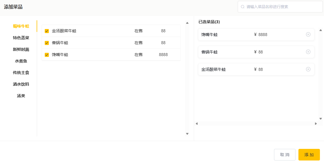 菜品分为几大类,在新增套餐功能中,需要添加套餐中对应的菜品