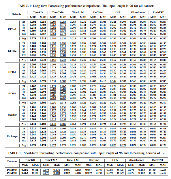 ①长期预测性能对比:文章在表I中报告了各方法的MSE和MAE指标。优于现有方法的结果以下划线标出,最佳结果用粗体表示。主要观察如下:TimeKD在所有数据集和所有预测长度(FH∈{24,36,48,96,192})上都取得了最佳结果。相比当前最强基线方法,TimeKD在MSE和MAE上分别提升了9.11%和7.52%。这一提升归因于TimeKD的特权知识蒸馏机制,该机制利用校准后的LLM从文本模态中提取嵌入,并通过蒸馏将这些知识迁移到学生模型中。文章还观察到,在ETTm2数据集上的提升超过其他数据集,因为ETTm2具有更高的采样频率和更细粒度的数值记录。这说明TimeKD能够在高频数据场景下学习更鲁棒的表示。总体而言,基于LLM的方法在大多数情况下优于Transformer方法。这表明LLM具有更强的知识迁移能力。Transformer在所有数据集上的表现最差,尤其是在ETTh数据集(变量较少)上更明显,这与其结构简单、缺乏参数有关。TimeCMA在现有方法中表现较优,这得益于其能够捕捉抽象的全局时间趋势,以及通过跨模态对齐设计来获取更稳健的时间序列表示。