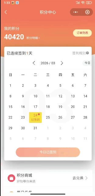 签到是门槛最低的积分获取方式,旨在培养用户的每日访问习惯。在该小程序中: