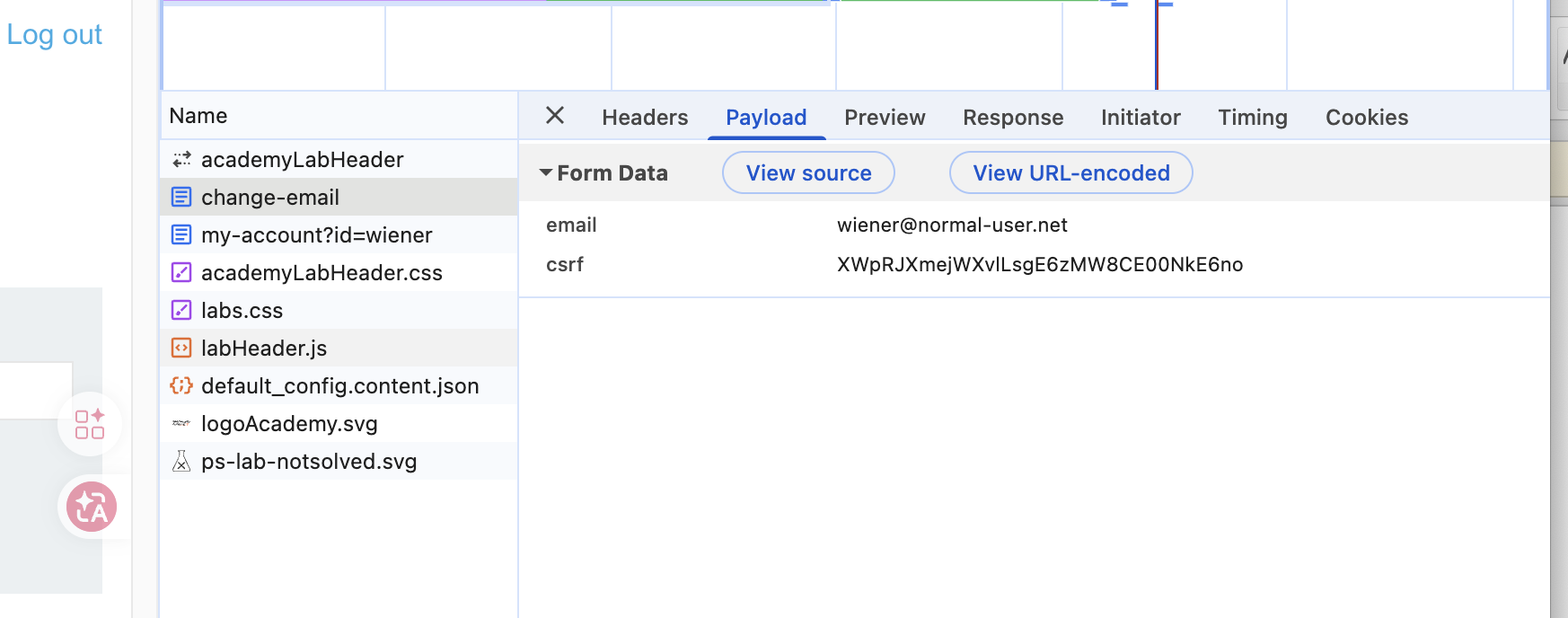 执行过程: 进入Lab,使用提供的身份信息登录环境,这时候可以发现存储修改邮箱的功能,可以记录下它的路径和对应请求参数,可以发现需要一个邮箱参数,还需要csrf这个参数,当然了cookie会随着请求发送到目标。