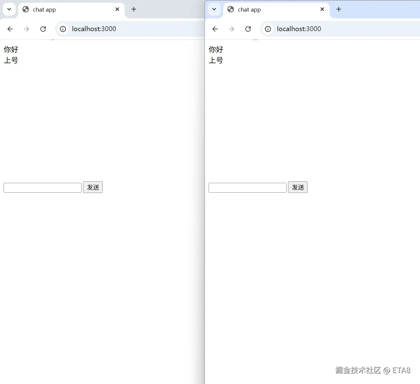 打开浏览器访问 localhost:3000,你可以打开好几个标签页,在一个标签页发消息,所有标签页都会实时收到消息!这就是广播。