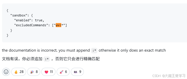 将 curl 纳入 excludedCommands ,即 "excludedCommands": ["docker", "curl"] ,理论上 curl 命令就不应该在沙箱中运行了,但是实际发现仍然在沙箱中运行。查了一下 Claude Code 仓库的 issue ,发现属于官方文档中的一个bug。