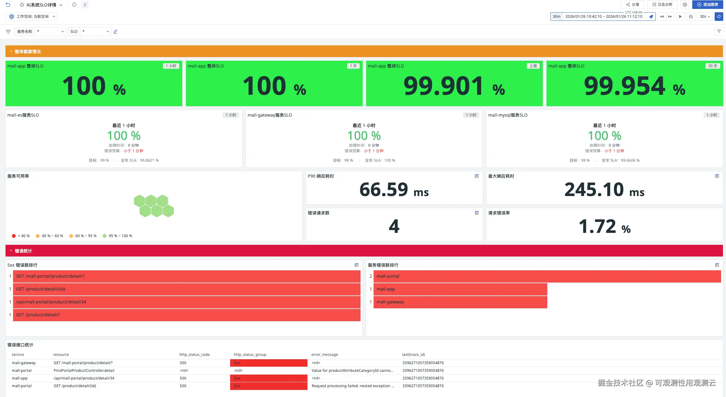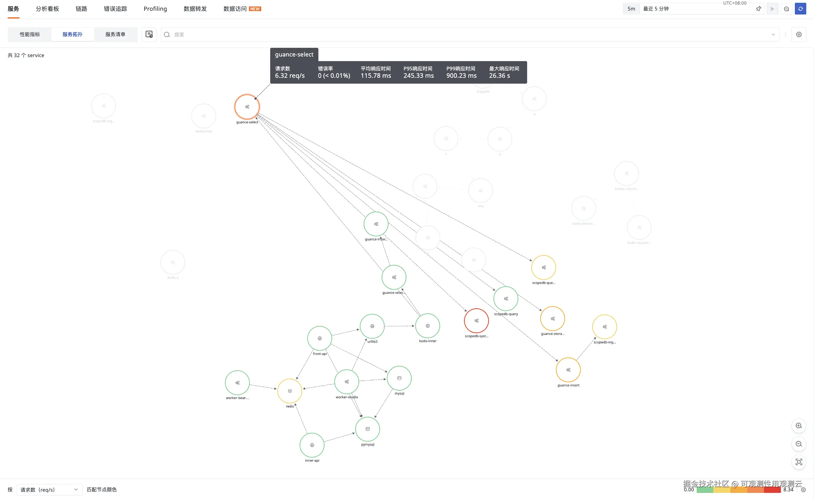 观测云会盯着质量的变化。从服务集中管理入口中进入,以全局的视角将分布式系统中的性能指标、调用拓扑、服务清单及全量观测数据(包括链路、日志、基础设施等)进行聚合与串联,从而提供从全局状态总览到单个服务深度诊断的一体化分析能力。