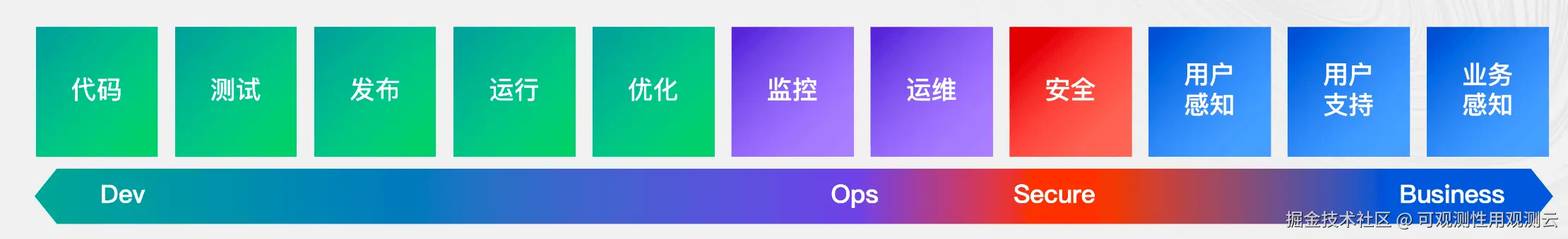 从一个需求诞生 ------ 代码构建 ------ 测试 ------ 发布 ------ 上线 ------ 用户体验,全栈感知 Dev-Ops-Secure-Business 全流程。